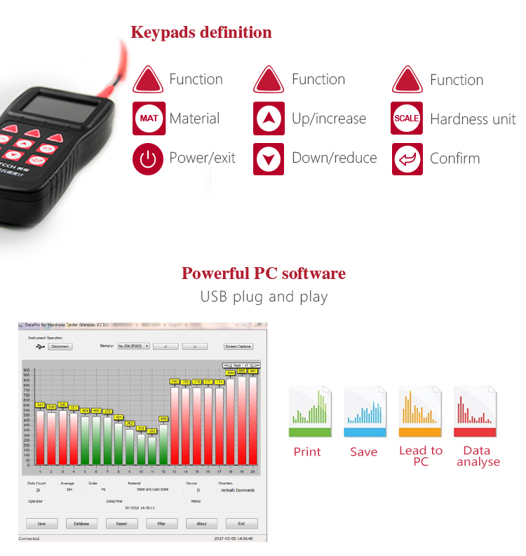 It can store 500 groups (impact times 32 ~ 1) hardness values, each data includes single testing value, average value, measurement date / time, impact direction, frequency, material, hardness and other information.