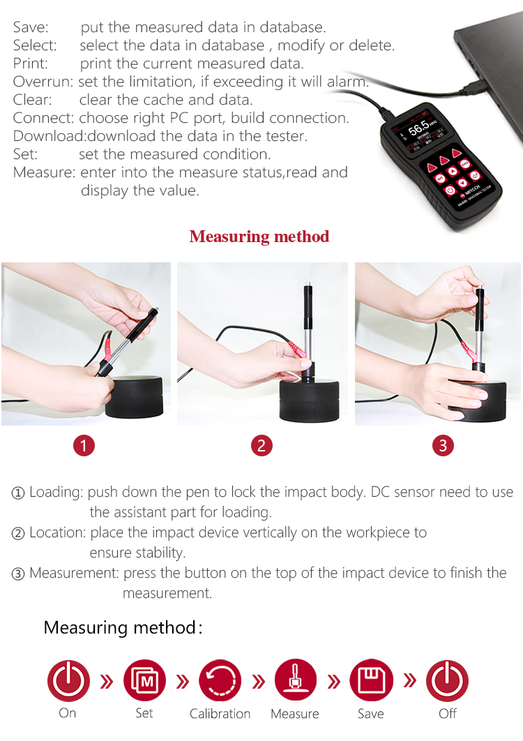 Working PrincipleThe basic principle is to use an impact body of certain weight impacts against the testing surface under certain test force, then measure the impacting velocity and the rebounding velocity of the impact body respectively when the spherically test tip is located 1mm above the testing surface.