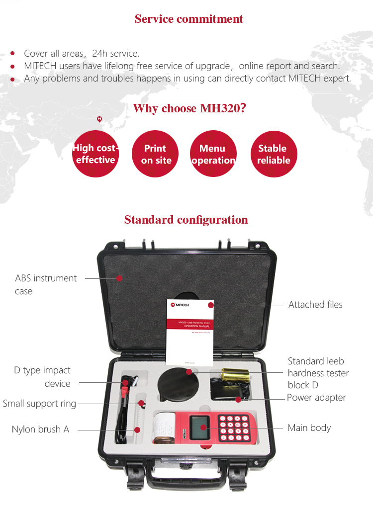 | Mitech Series portable leeb hardness testers with customized attached files including product certificate, warranty card, product manual, packing list. The attached files adopt the special printed paper. The manual is with graphic design, beautiful, easy to understand, easy to save for a long time. Note: The electronic version of Mitech attached files can be downloaded from m.jiu1915.cn. |