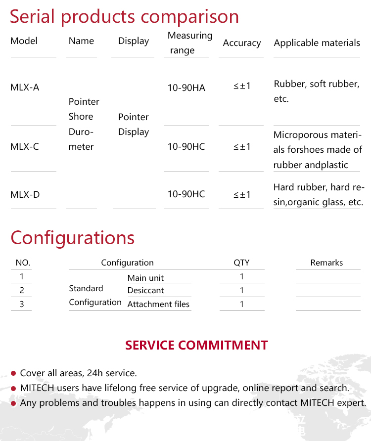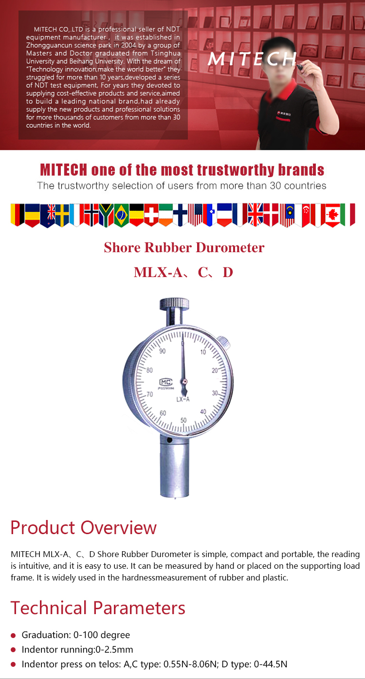 MITECH MLX-A、C、D Shore Rubber Durometer is simple, compact and portable, the reading is intuitive, and it is easy to use. It can be measured by hand or placed on the supporting load frame. It is widely used in the hardness measurement of rubber and plastic.