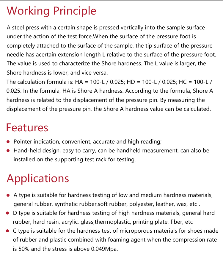 • C type is suitable for the hardness test of microporous materials for shoes made of rubber and plastic combined with foaming agent when the compression rate is 50% and the stress is above 0.049Mpa.