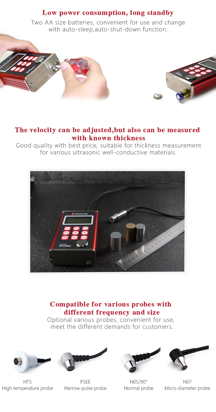 Mitech series ultrasonic thickness gauges, with low-power design and long standby, MT150/MT160/MT200/MT180/MT190/MT600/MT660 are with two AA size alkaline batteries for power supply, easy to replace.