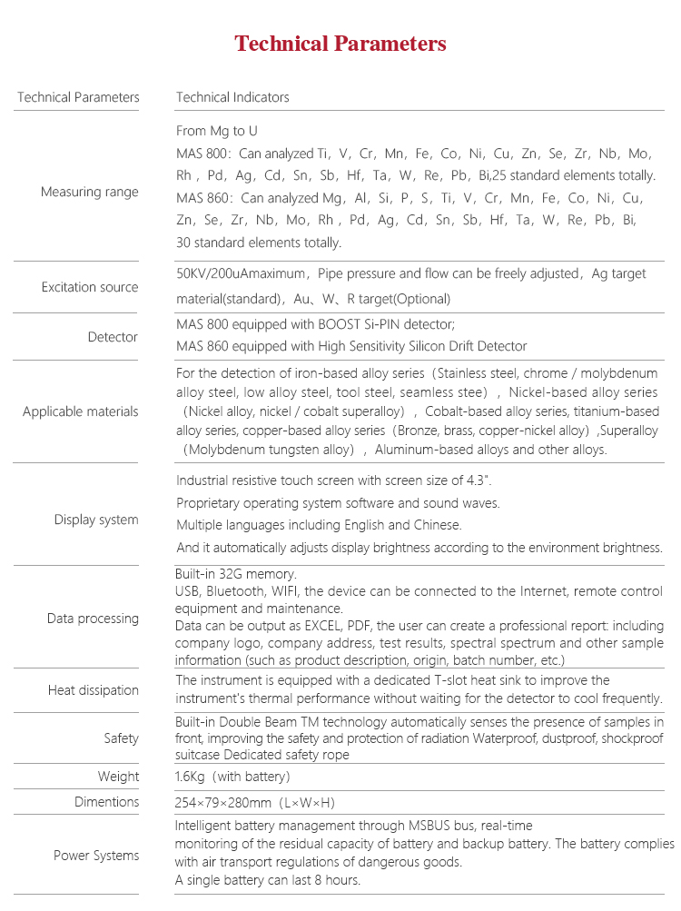 Product OverviewMITECH MAS860 Portable spectrometer, also called alloy analyzer. It adopts the principle of energy and wavelength differences in X-ray generated by metal atoms when energy level flips, so as to analysis element type and content in alloy material. Small size and light weight makes it convenient to work on site. It is easy to operate without tricky skills. A variety of elemental content can be measured at once in solid/powder/liquid sample detection. It is also designed with low consumption, high speed analysis and high accuracy; widely used in the field of analysis of elements such as boiler containers, petrochemical refining, iron and steel smelting, nonferrous metals, aerospace, weapons manufacturing and other elements that need to analyze Na or above to U. MAS 860 is a necessary professional precision instrument to improve the production efficiency and pass rate as well as cost savings.