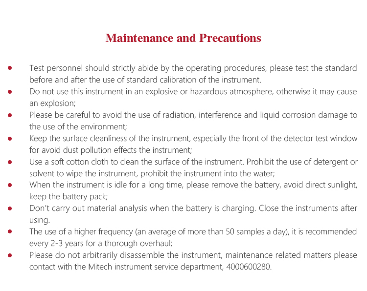 Instrument MaintenanceMitech MAS800 / 860 handheld X-ray fluorescence spectrometer is a precision detection equipment, the use of special attention should be paid to the following matters: