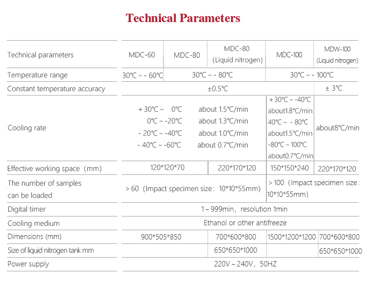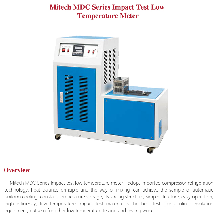 Product OverviewMitech MDC Series Impact test low temperature meter,adopt imported compressor refrigeration technology, heat balance principle and the way of mixing, can achieve the sample of automatic uniform cooling, constant temperature storage, its strong structure, simple structure, easy operation, high efficiency, low temperature impact test material is the best test Like cooling, insulation equipment, but also for other low temperature testing and testing work