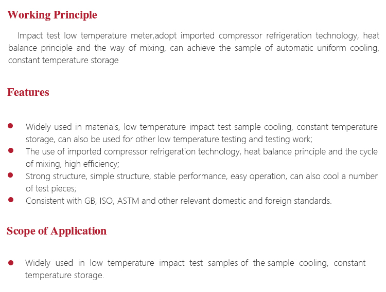 Working PrincipleImpact test low temperature meter,adopt imported compressor refrigeration technology, heat balance principle and the way of mixing, can achieve the sample of automatic uniform cooling, constant temperature storage