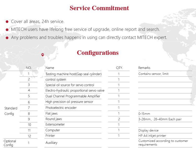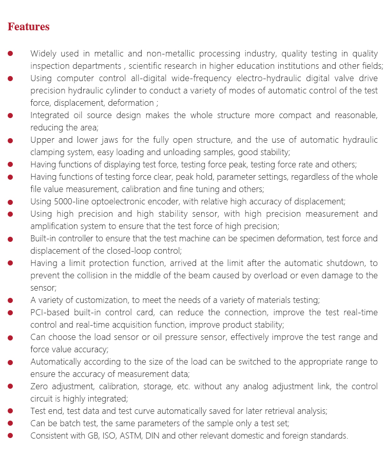 Product OverviewMitech MAW micro control series hydraulic universal testing machine , can conduct mechanical properties tests for metallic, non-metallic and composite materials including stretching, compression, bending, cutting, stripping, tearing and so on ,through controlling the high-pressure pump to drive the screw movement and equipped with the corresponding auxiliary. It uses manual and electro-hydraulic servo dual control mode, high-precision gap sealed cylinder, digital processing, closed-loop control technology, which has stable property, powerful function, accurate data processing, solid and simple structure, high reliability, simple performance, friendly interface. This product can be widely used in areas such as metallic and non-metallic processing industry, quality testing in quality inspection departments, scientific research in higher education institutions , which is a necessary professional precision testing equipment to improve production efficiency and save production costs.