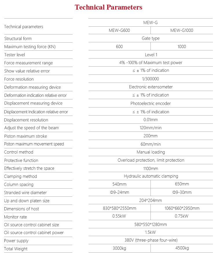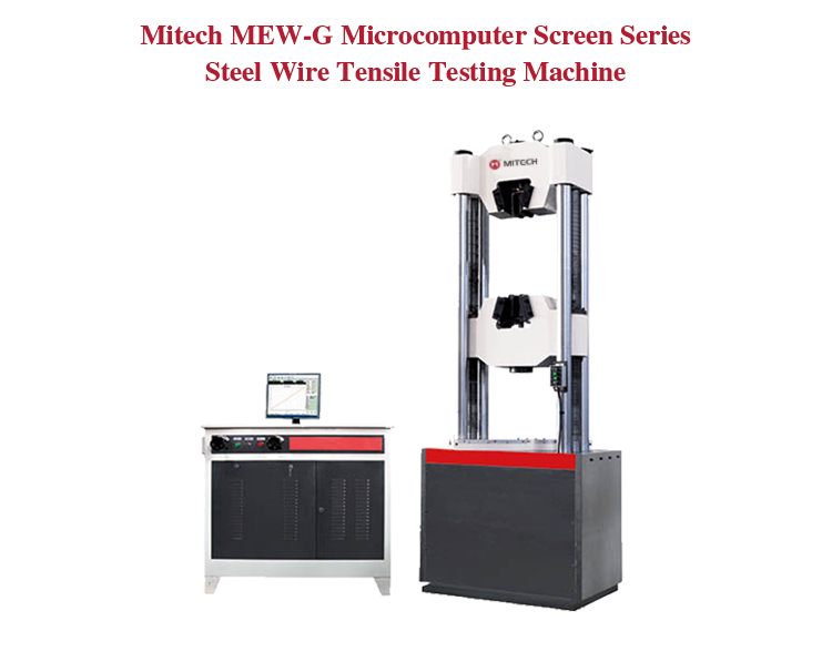 Mitech MEW-G microcomputer screen series steel wire tensile testing machine,by controlling the high-pressure pump to drive the screw movement,mainly for the prestressed steel strand tensile strength test and analysis.It is characterized by high precision gap sealing cylinder, microcomputer display technology, digitized processing and high precision data acquisition and control technology. Its performance is stable, powerful, accurate data processing, strong structure, simple structure, high reliability, simple operation and friendly interface.Widely used in metal and non-metallic processing industry, quality inspection departments quality testing, scientific research and other areas of higher education institutions.It is the necessary professional precision testing equipment for improving production efficiency and saving production costs.