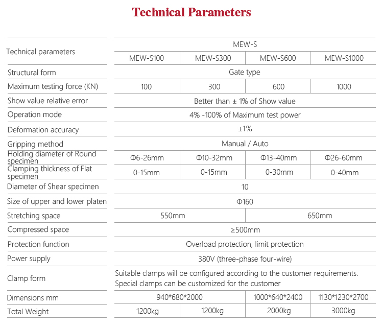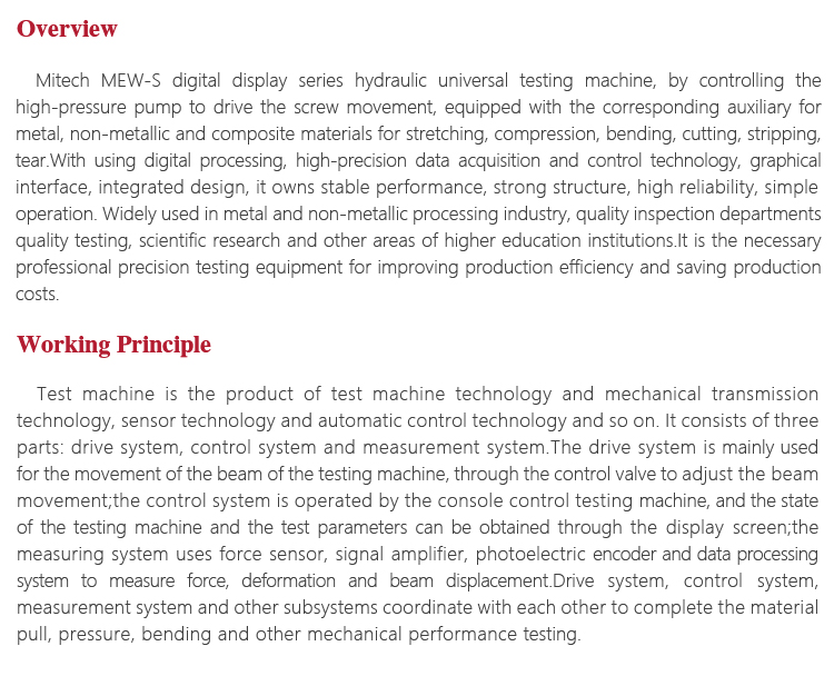 Product OverviewMitech MEW-S digital display series hydraulic universal testing machine, by controlling the high-pressure pump to drive the screw movement, equipped with the corresponding auxiliary for metal, non-metallic and composite materials for stretching, compression, bending, cutting, stripping, tear.With using digital processing, high-precision data acquisition and control technology, graphical interface, integrated design, it owns stable performance, strong structure, high reliability, simple operation. Widely used in metal and non-metallic processing industry, quality inspection departments quality testing, scientific research and other areas of higher education institutions.It is the necessary professional precision testing equipment for improving production efficiency and saving production costs