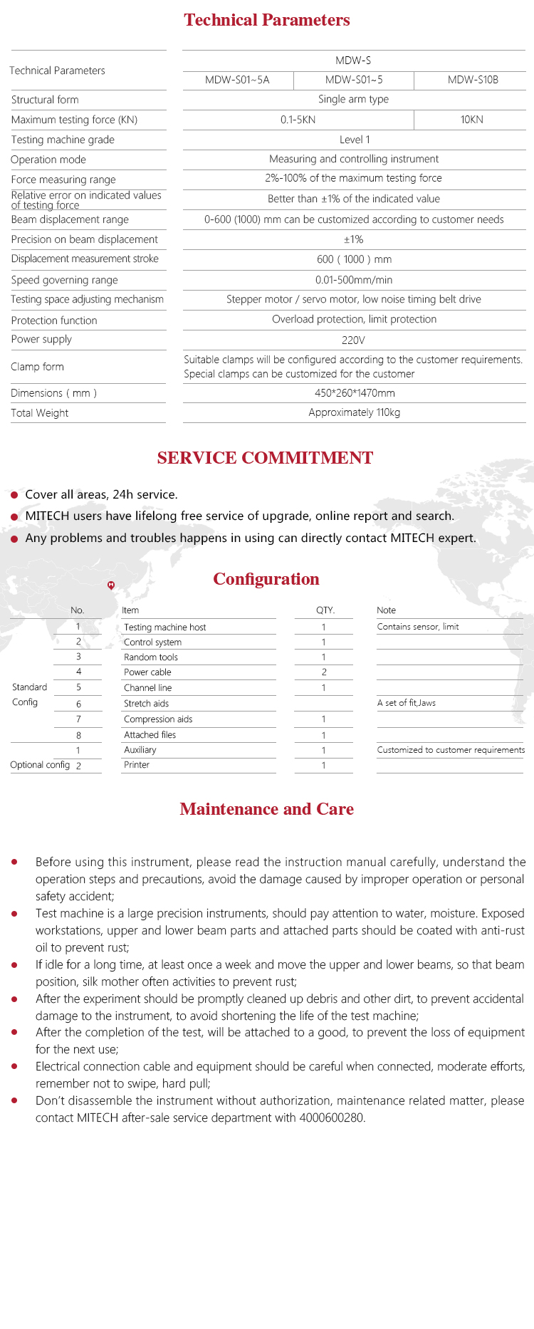 Mitech MDW-S digital display series gate type  electronic universal  testing machine,through the single-chip automatic control motor driving screw movement, equipped with the corresponding auxiliary for metal, non-metallic and composite materials for pull, pressure, bending and other mechanical properties test.( The tensile test is carried out between the upper beam of the main body and the moving beam, and the compression and bending tests are carried out between the main plate and the moving beam. ),it use of built-in controller, AC servo motor, automatic control and data acquisition system, stable performance, strong structure, high reliability, simple operation, high degree of automation. Widely used in metal and non-metallic processing industry, quality inspection departments quality testing, scientific research and other areas of higher education institutions, is to improve production efficiency and save production costs necessary professional precision testing equipment.