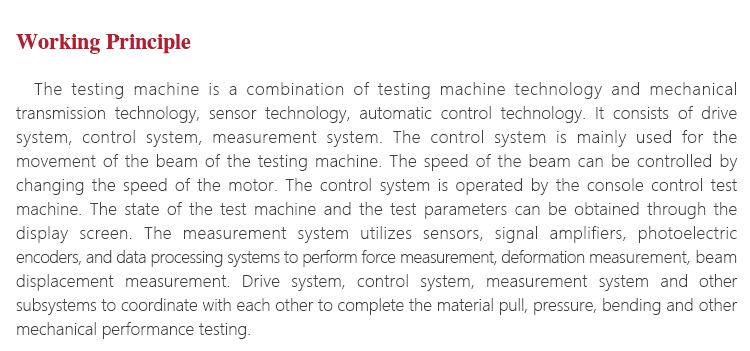 The testing machine is a combination of testing machine technology and mechanical transmission technology, sensor technology, automatic control technology. It consists of drive system, control system, measurement system. The control system is mainly used for the movement of the beam of the testing machine. The speed of the beam can be controlled by changing the speed of the motor. The control system is operated by the console control test machine. The state of the test machine and the test parameters can be obtained through the display screen. The measurement system utilizes sensors, signal amplifiers, photoelectric encoders, and data processing systems to perform force measurement, deformation measurement, beam displacement measurement. Drive system, control system, measurement system and other subsystems to coordinate with each other to complete the material pull, pressure, bending and other mechanical performance testing.