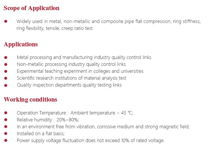 Function & applicationWidely used in metal, non-metallic and composite pipe flat compression, ring stiffness, ring flexibility, tensile, creep ratio test.