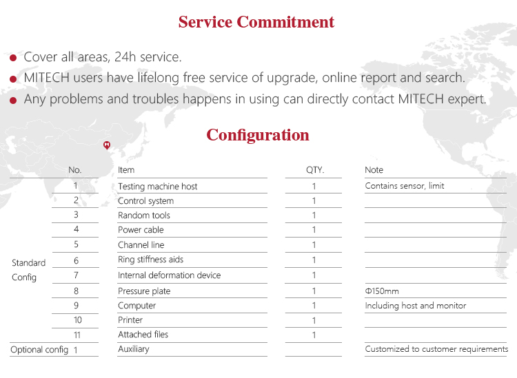 Mitech MDW-H micro control series gate type ring stiffness testing machine.Through the computer control motor drive screw movement, for a variety of pipe ring stiffness, ring flexibility and flat test, while the increase in demand, such as stretching, bending and other functional tests,it use of built-in controller, AC servo motor,stable performance, strong structure, high reliability, simple operation, high degree of automation. Widely used in metal and non-metallic processing industry, quality inspection departments quality testing, scientific research and other areas of higher education institutions, is to improve production efficiency and save production costs necessary professional precision testing equipment.
