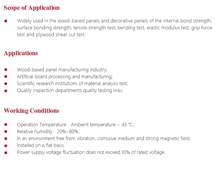 l Widely used in the wood-based panels and decorative panels of the internal bond strength, surface bonding strength, tensile strength test, bending test, elastic modulus test, grip force test and plywood shear cut test;