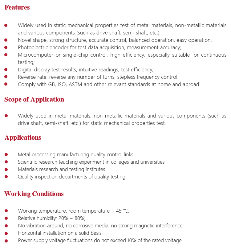 Widely used in metal materials, non-metallic materials and various components (such as drive shaft, semi-shaft, etc.) for static mechanical properties test.