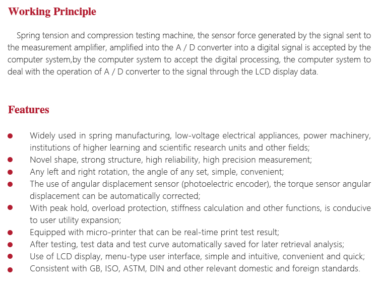 Spring tension and compression testing machine, the sensor force generated by the signal sent to the measurement amplifier, amplified into the A / D converter into a digital signal is accepted by the computer system,by the computer system to accept the digital processing, the computer system to deal with the operation of A / D converter to the signal through the LCD display data.