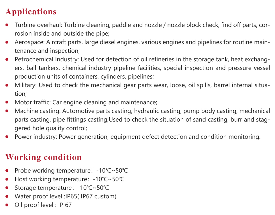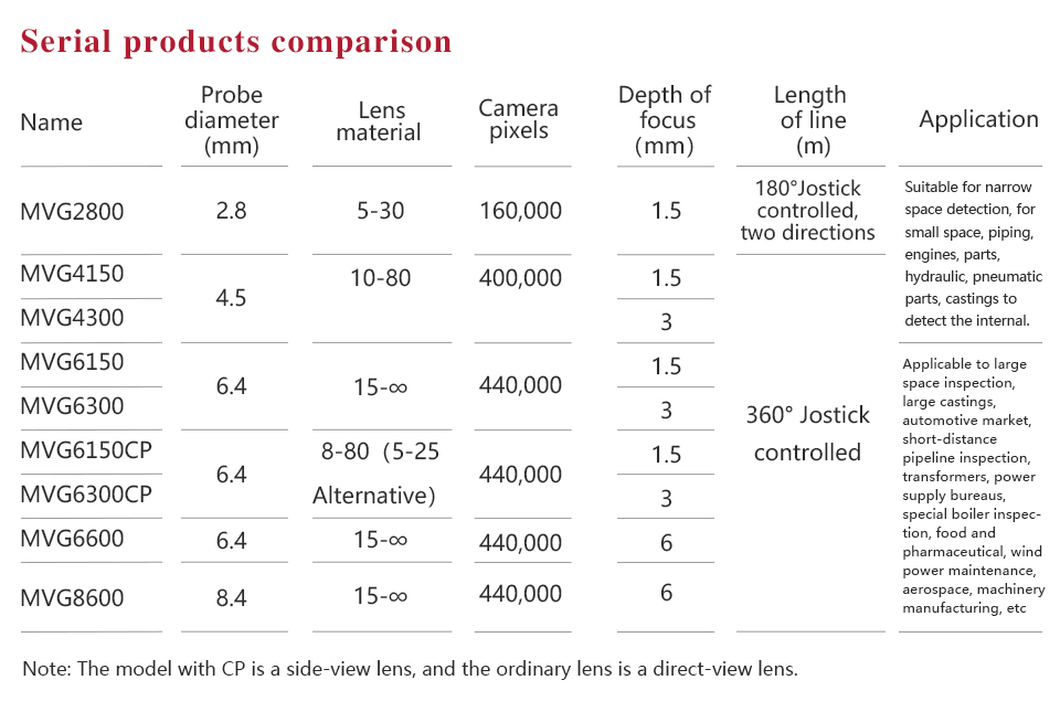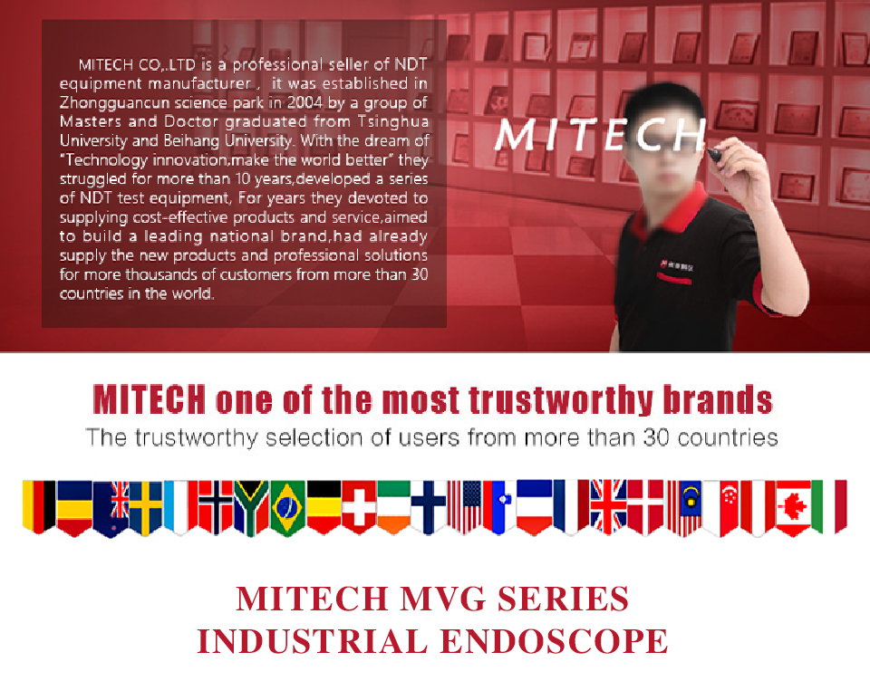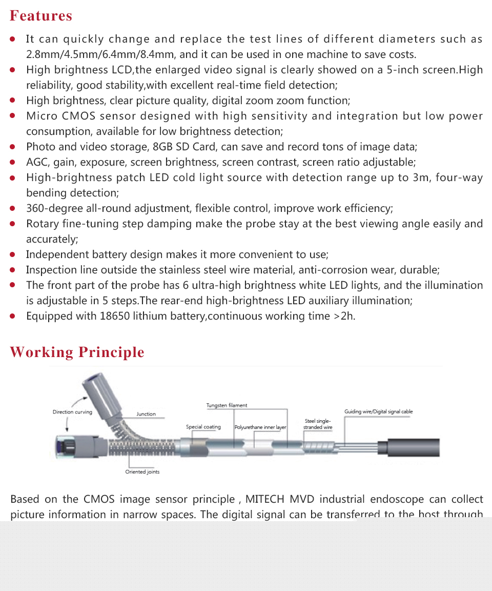 Product OverviewMITECH MVG series of industrial endoscope, based on the CMOS image sensor principle, can realize image shooting in the pipe or narrow area which can not be directly observed. And the results can be displayed in high-definition ,so as to achieve non-destructive testing. MITECH MVG series endoscope is a high-precision video electronics industry endoscope, the use of color LCD display and highly integrated CMOS image sensor to ensure that the video endoscopic image of the clear, realistic; its low power consumption, quick signal transmission speed ,easy to carry and operate,different diameter testing lines can be replaced to achieve multi-purpose use and cost saving. It can detect pipe or narrow spaces without tearing apart or damaging machine while not working.Cracks, welds, foreign body, wear and internal processing of parts and other circumstances can be detected with high quality images. It is widely used in aerospace, petrochemical, mechanical casting, national defense military, power production, automobile transportation and other fields, and is the important detection and monitoring equipment of industrial equipment testing and maintenance and other aspects.