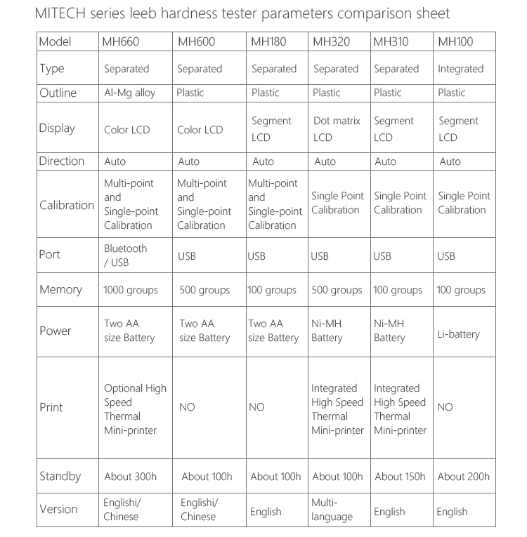 | Mitech portable Leeb hardness testers,with low-power consumption design and long standby, MH180/MH200/MH600/MH660 all adopt two AA size alkaline batteries for power supply. | |