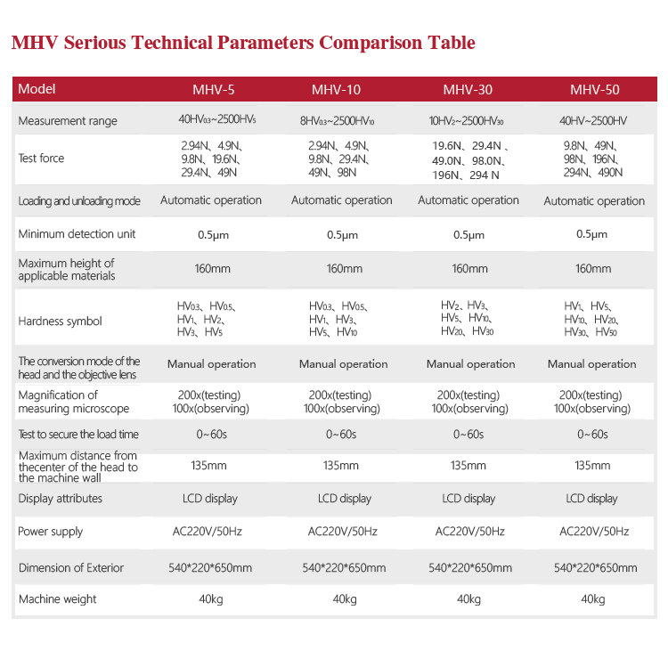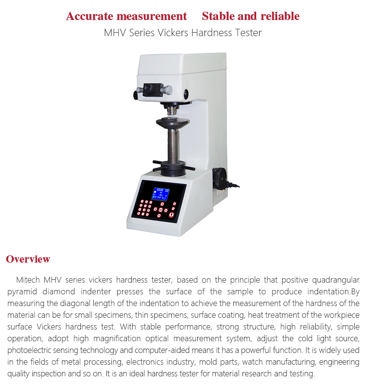 Product OverviewMitech MHV series vickers hardness tester, based on the principle that positive quadrangular pyramid diamond indenter presses the surface of the sample to produce indentation.By measuring the diagonal length of the indentation to achieve the measurement of the hardness of the material can be for small specimens, thin specimens, surface coating, heat treatment of the workpiece surface Vickers hardness test. With stable performance, strong structure, high reliability, simple operation, adopt high magnification optical measurement system, adjust the cold light source, photoelectric sensing technology and computer-aided means it has a powerful function. It is widely used in the fields of metal processing, electronics industry, mold parts, watch manufacturing, engineering quality inspection and so on. It is an ideal hardness tester for material research and testing.