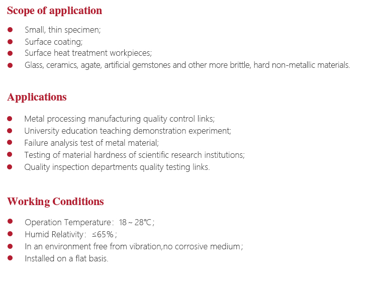 Instrument FeaturesWidely used in micro-specimen, thin specimen, surface coating, heat treatment of workpiece surface samples and etc.Vickers hardness test to meet different demands of scientific research institutions, precision machining and quality inspection departments and other materials research;