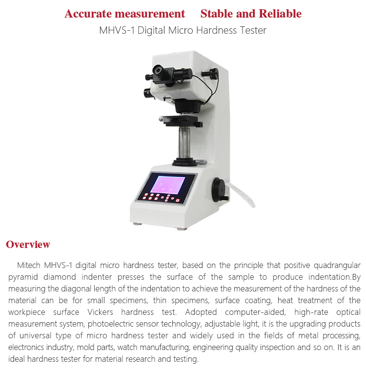 Product OverviewMitech MHVS-1digital micro hardness tester, based on the principle that positive quadrangular pyramid diamond indenter presses the surface of the sample to produce indentation.By measuring the diagonal length of the indentation to achieve the measurement of the hardness of the material can be for small specimens, thin specimens, surface coating, heat treatment of the workpiece surface Vickers hardness test. Adopted computer-aided, high-rate optical measurement system, photoelectric sensor technology, adjustable light, it is the upgrading products of universal type of micro hardness tester and widely used in the fields of metal processing, electronics industry, mold parts, watch manufacturing, engineering quality inspection and so on. It is an ideal hardness tester for material research and testing.
