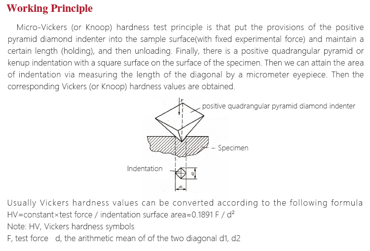 Working PrincipleMicro-Vickers (or Knoop) hardness test principle is that put the provisions of the positive pyramid diamond indenter into the sample surface(with fixed experimental force) and maintain a certain length (holding), and then unloading. Finally, there is a positive quadrangular pyramid or kenup indentation with a square surface on the surface of the specimen. Then we can attain the area of indentation via measuring the length of the diagonal by a micrometer eyepiece. Then the corresponding Vickers (or Knoop) hardness values are obtained.