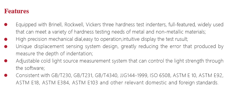 Instrument Featuresl Equipped with Brinell, Rockwell, Vickers three hardness test indenter, full-featured, widely used that can meet a variety of hardness testing needs of metal and non-metallic materials;