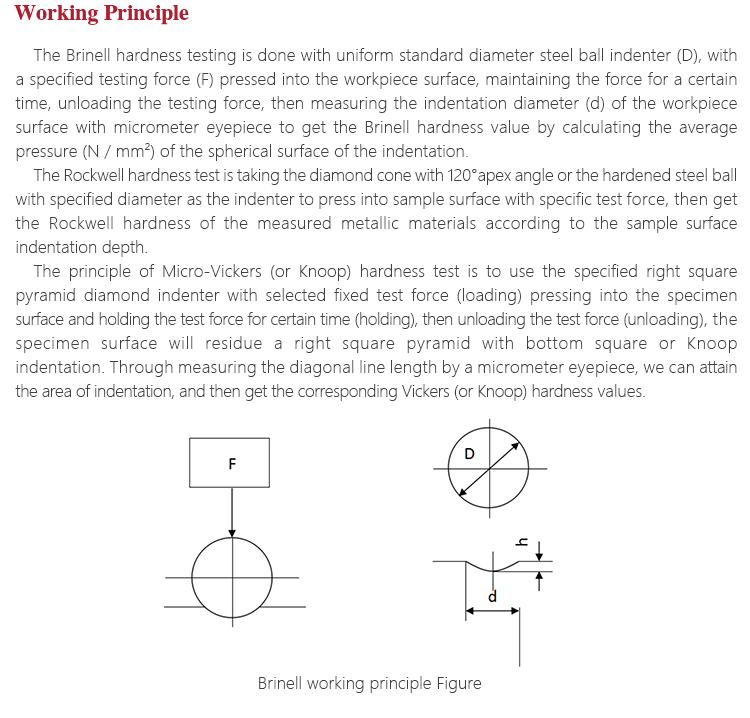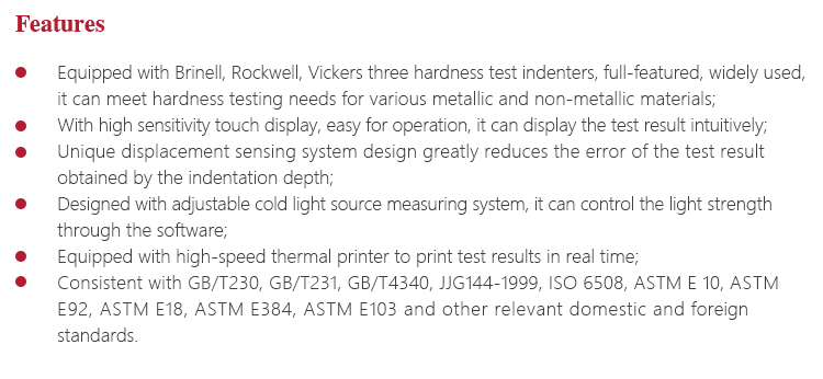 or spherical cemented carbide indenter pressing into the sample surface to produce indentation, realizing Brinell, Rockwell, Vickers three different materials hardness measurement by measuring the depth or diameter of the indentation.  With novel appearance, full-featured, high sensitivity touch screen design, equipped with embedded operating system, simple