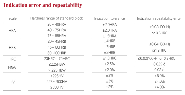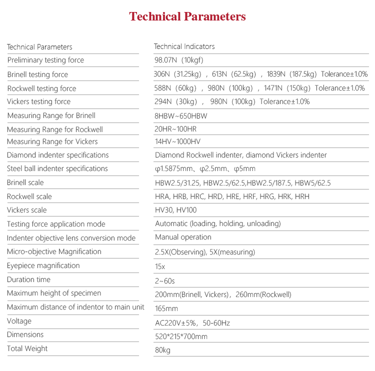 Brinell testing force 306N(31.25kg),613N(62.5kg),1839N(187.5kg)Tolerance±1.0%