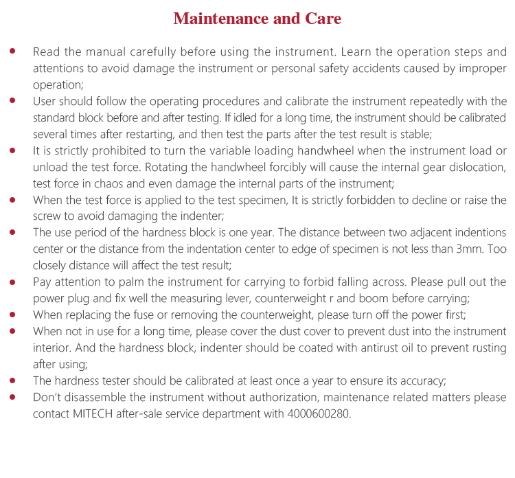 l When not in use for a long time, please cover the dust cover to prevent dust into the instrument interior. And the hardness block, indenter should be coated with antirust oil to prevent rusting after using.