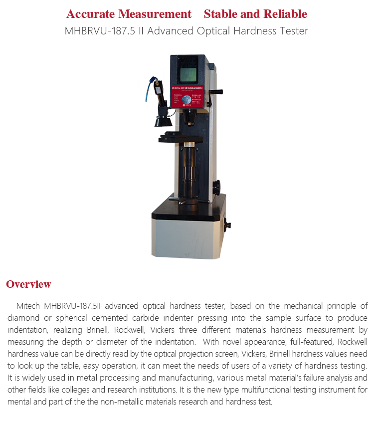 Product OverviewMitech MHBRVU-187.5II advanced optical hardness tester, based on the mechanical principle of diamond or spherical cemented carbide indenter pressing into the sample surface to produce indentation, realizing Brinell, Rockwell, Vickers three different materials hardness measurement by measuring the depth or diameter of the indentation. With novel appearance, full-featured, Rockwell hardness value can be directly read by the optical projection screen, Vickers, Brinell hardness values need to look up the table, easy operation, it can meet the needs of users of a variety of hardness testing. It is widely used in metal processing and manufacturing, various metal material’s failure analysis and other fields like colleges and research institutions. It is the new type multifunctional testing instrument for mental and part of the the non-metallic materials research and hardness test.