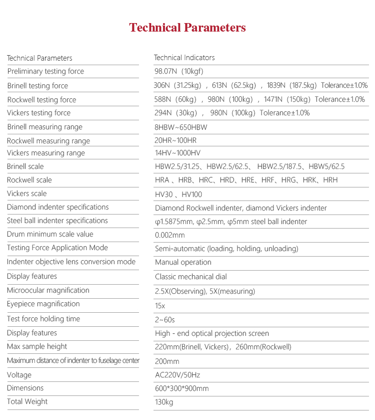| Vickers testing force | 294N(30kg), 980N(100kg)Tolerance±1.0% |