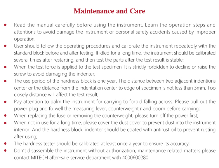 l When not in use for a long time, please cover the dust cover to prevent dust into the instrument interior. And the hardness block, indenter should be coated with antirust oil to prevent rusting after using.