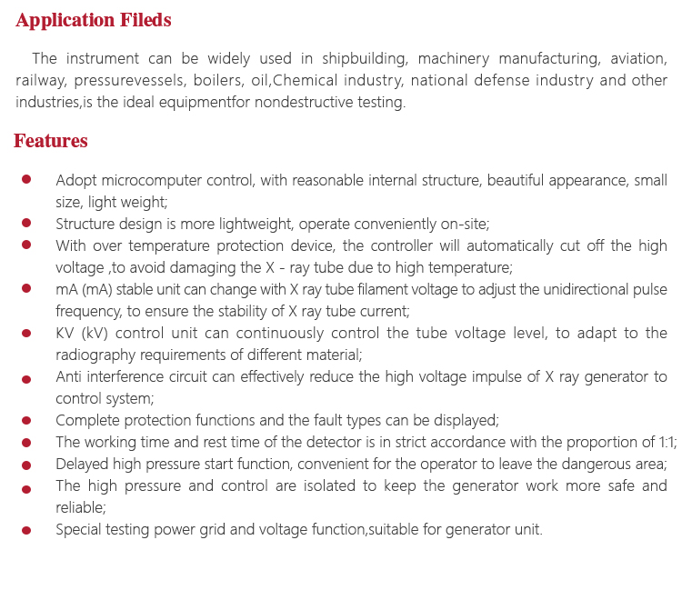 When using this generator there should be x radiation protection facilities. For example, using 2mm thick tinplate forprotection. If there is no protection measurement, we should take X ray generator as the center, keep no one in the field within a radius of 20 meters. Meet the safety requirements before radiographic.