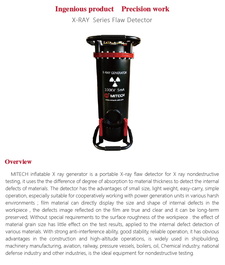 MITECH inflatable X ray generator is a portable X-ray flaw detector for X ray nondestructive testing, it uses the the difference of degree of absorption to material thickness to detect the internal defects of materials. The detector has the advantages of small size, light weight, easy-carry, simple operation, especially suitable for cooperatively working with power generation units in various harsh environments ; film material can directly display the size and shape of internal defects in the workpiece , the defects image reflected on the film are true and clear and it can be long-term preserved; Without special requirements to the surface roughness of the workpiece . the effect of material grain size has little effect on the test results, applied to the internal defect detection of various materials. With strong anti-interference ability, good stability, reliable operation, it has obvious advantages in the construction and high-altitude operations, is widely used in shipbuilding, machinery manufacturing, aviation, railway, pressure vessels, boilers, oil, Chemical industry, national defense industry and other industries, is the ideal equipment for nondestructive testing.
