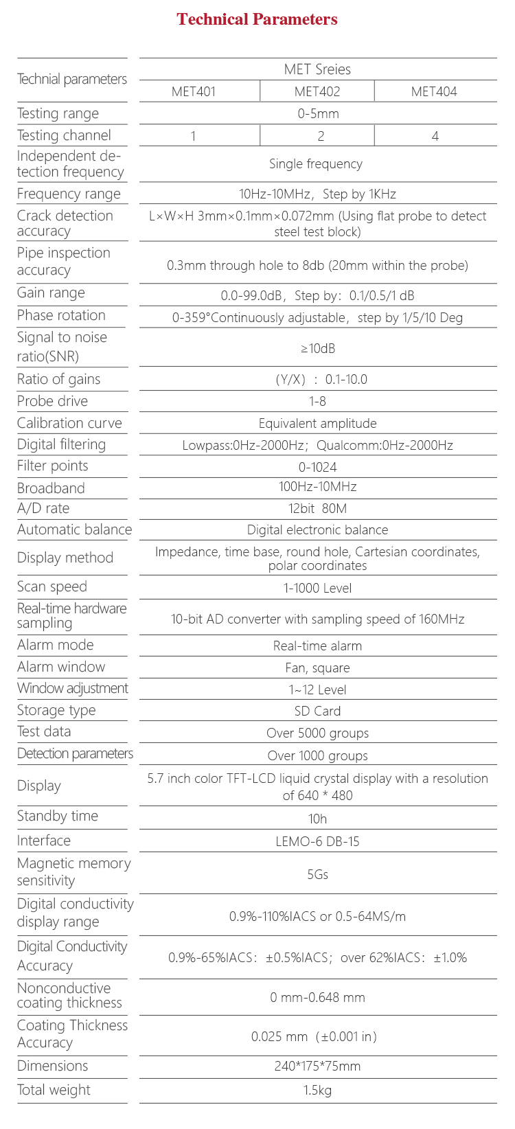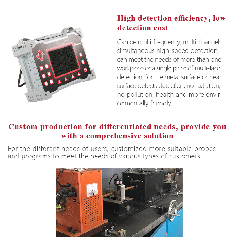 Mitech MET Series Portable Eddy Current Flaw Detector,also known as digital electromagnetic detecor,based on the principle of electromagnetic induction,can detect various metal parts surface or near surface defects with high-speed. It uses advanced DSP digital processing and FPGA technology innovation designed, with 5.7-inch TFT LCD screen, can clearly display the detection data.The product has high sensitivity, stable performance, multi-channel simultaneous detection and intelligent data analysis, can be equipped with intelligent probe, can also be customized probe according to customer needs , with extended magnetic memory, coating thickness, conductivity measurement and other practical Features. It is widely used in all kinds of metal pipe rods, auto parts, bearings, oil casing, oil control rods, ring metal parts in non-destructive testing and scientific research and other areas of higher education research.It is the necessary professional precision testing equipment to improve production efficiency, saving production costs.