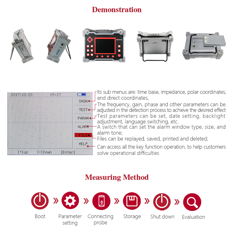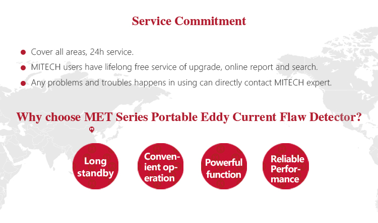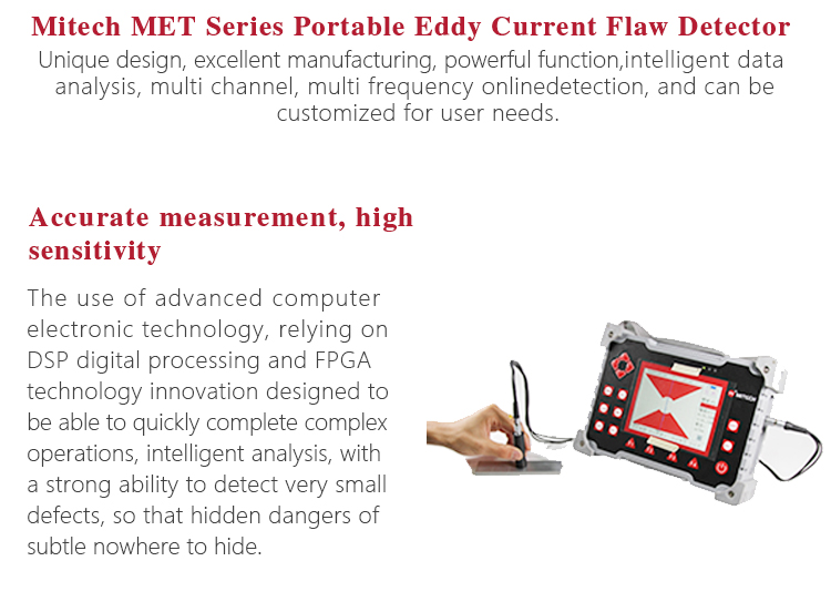 Product OverviewMitech MET Series Portable Eddy Current Flaw Detector,also known as digital electromagnetic detecor,based on the principle of electromagnetic induction,can detect various metal parts surface or near surface defects with high-speed. It uses advanced DSP digital processing and FPGA technology innovation designed, with 5.7-inch TFT LCD screen, can clearly display the detection data.The product has high sensitivity, stable performance, multi-channel simultaneous detection and intelligent data analysis, can be equipped with intelligent probe, can also be customized probe according to customer needs , with extended magnetic memory, coating thickness, conductivity measurement and other practical Features. It is widely used in all kinds of metal pipe rods, auto parts, bearings, oil casing, oil control rods, ring metal parts in non-destructive testing and scientific research and other areas of higher education research.It is the necessary professional precision testing equipment to improve production efficiency, saving production costs.