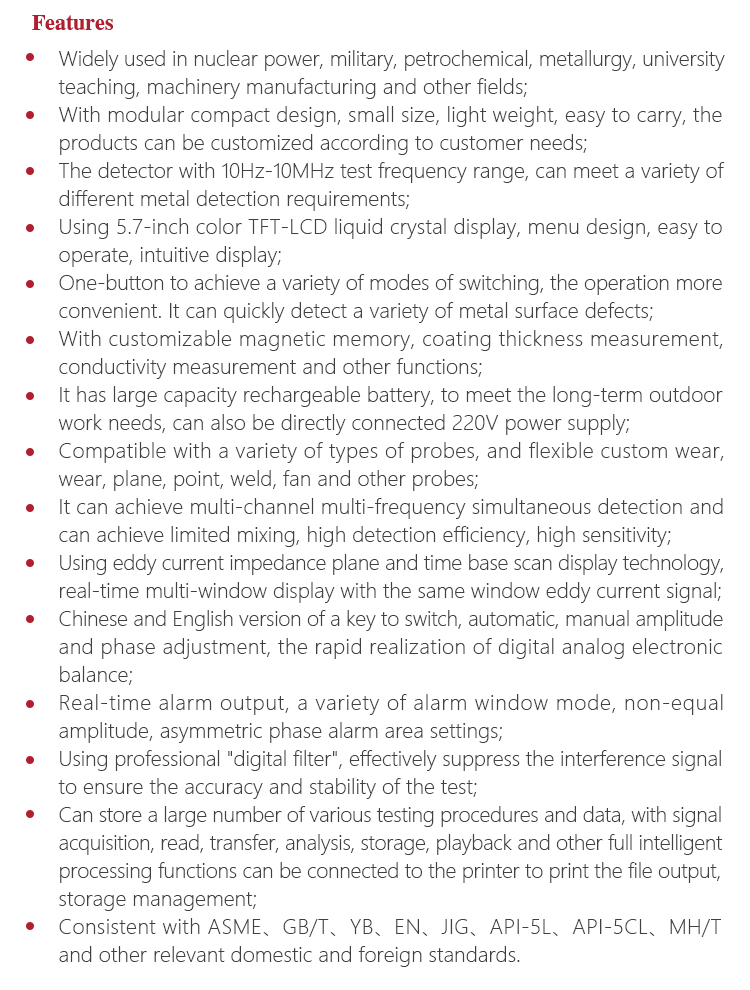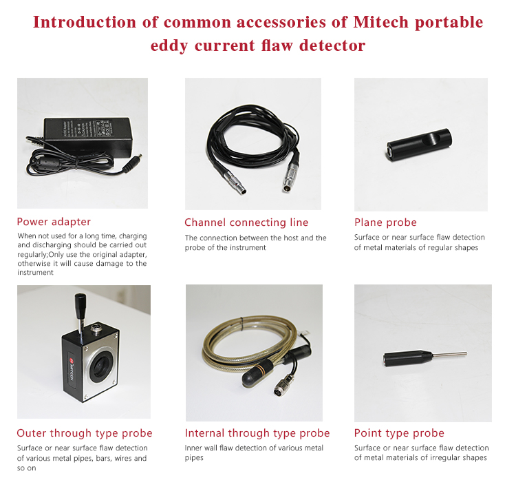 Mitech MET Series Portable Eddy Current Flaw Detector,also known as digital electromagnetic detecor,based on the principle of electromagnetic induction,can detect various metal parts surface or near surface defects with high-speed. It uses advanced DSP digital processing and FPGA technology innovation designed, with 5.7-inch TFT LCD screen, can clearly display the detection data.The product has high sensitivity, stable performance, multi-channel simultaneous detection and intelligent data analysis, can be equipped with intelligent probe, can also be customized probe according to customer needs , with extended magnetic memory, coating thickness, conductivity measurement and other practical Features. It is widely used in all kinds of metal pipe rods, auto parts, bearings, oil casing, oil control rods, ring metal parts in non-destructive testing and scientific research and other areas of higher education research.It is the necessary professional precision testing equipment to improve production efficiency, saving production costs.