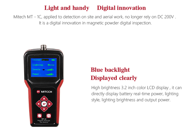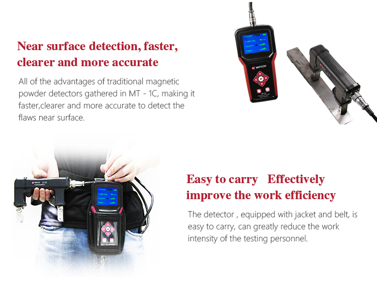 MITECH magnetic detectors pockets and belts, portable compact, the operator can tilt the instrument across the waist, greatly reducing the labor intensity of the flaws, improve work efficiency, especially for the field, high altitude testing and other special occasions flaw detection.