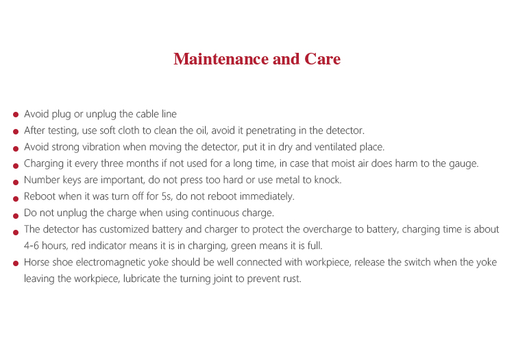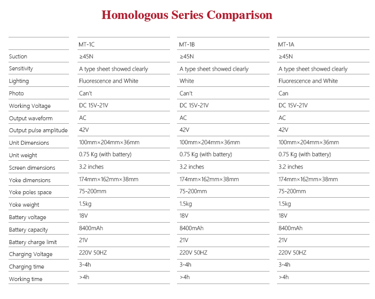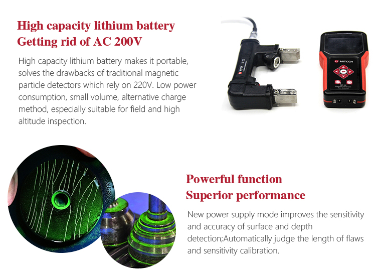 MT-1C magnetic particle flaw detector adopts high-capacity lithium battery pack, can convert DC to AC through variable-frequency, provide magnetic powder flaw detector with magnetic power supply. With low power consumption, it can continuous work for more than four hours after charging. It is especially proper for working in the wild and aerial area.
