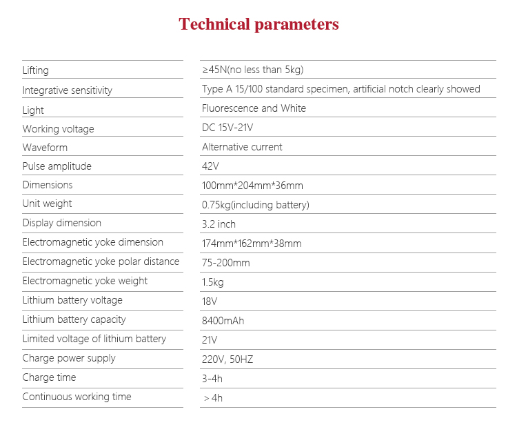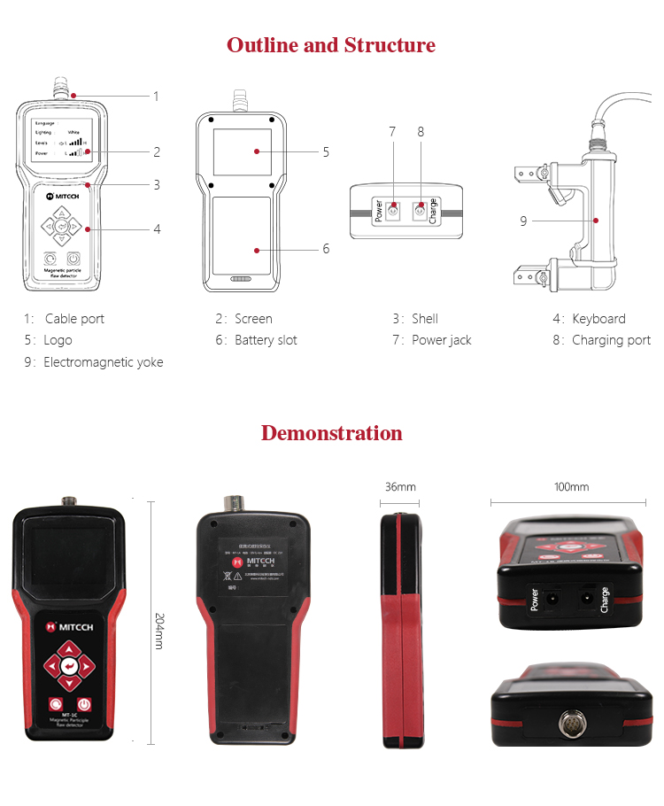 MITECH Portable Magnetic Flaw Detector Electromagnetic Yoke,Size: 174mm * 162mm * 38mm, Electromagnetic yoke distance: 75-200mm, Electromagnetic yoke Weight: 1.5kg.The use of pulsating power supply technology, continuous uninterrupted work, from the traditional electromagnetic yoke must be the gap time limit. At the same time lighting brightness, power, yoke spacing adjustable to meet your needs of different measurement conditions.
