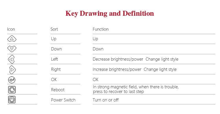 l Adjustable illumination brightness and working power can meet different testing demand and save the setting.