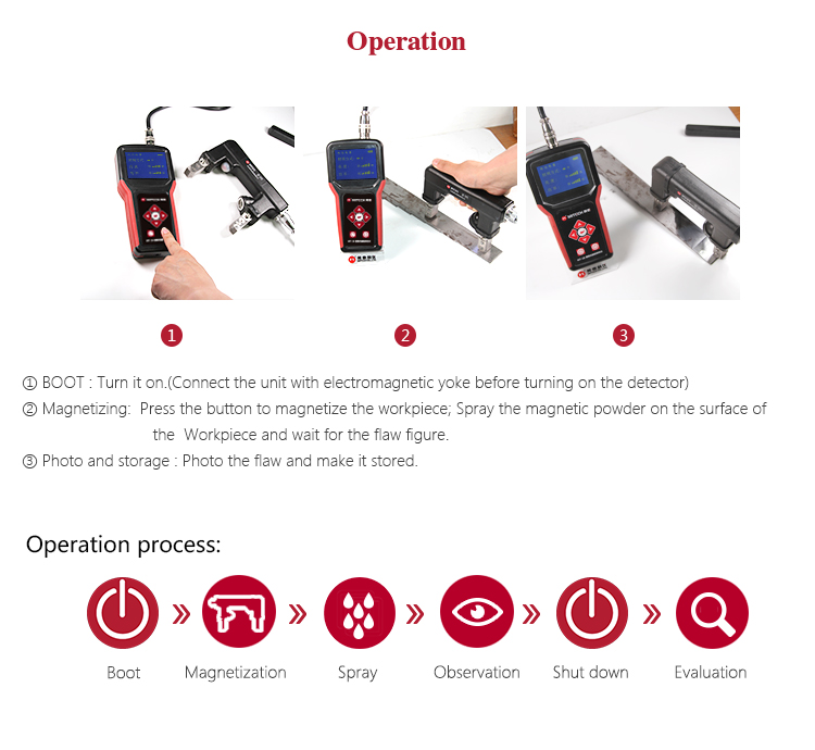 Put the workpiece into high-intensity magnetic field, connect electric to make it magnetized, if there are flaws (crack,slag) in or near the surface, there will be a leakage around the flaws. Put good quality magnetic powder(usually the magnetic iron oxide powder)on the object, magnetic powder will gather together near the leaked magnetic field, piled up to form visible traces of magnetic powder. In the proper light, we can see the marks and judge the position, size, shape and degree of the flaws.
