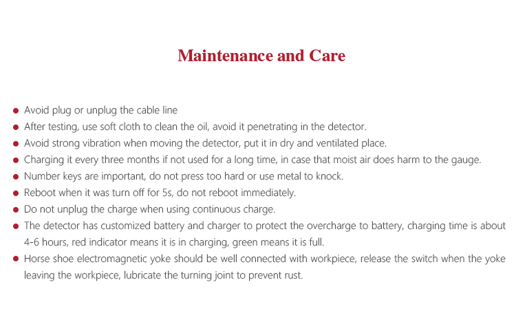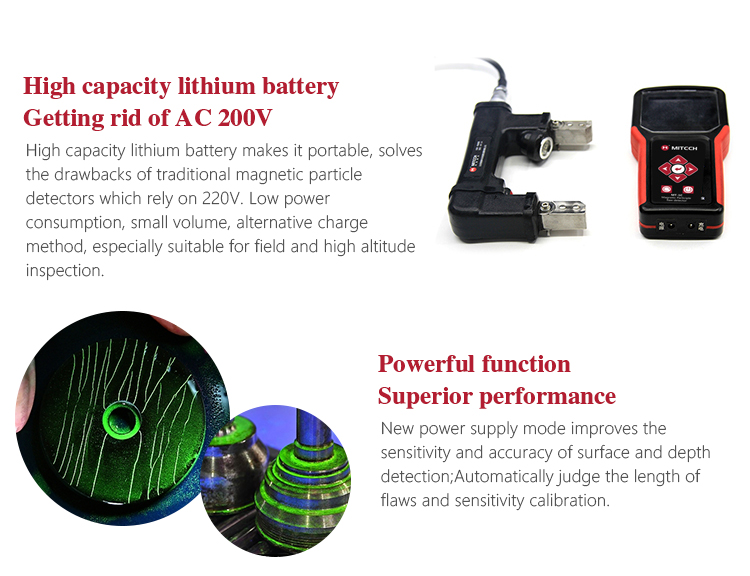 l High capacity lithium battery makes it portable, solves the drawbacks of traditional, magnetic particle detector relying on 220V. Low power consumption, small volume, alternative charge method, especially suitable for field and high altitude inspection.