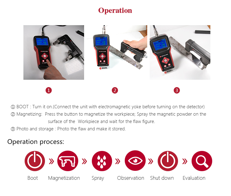 Working PrinciplePut the workpiece into high-intensity magnetic field, connect electric to make it magnetized, if there are flaws (crack,slag) in or near the surface, there will be a leakage around the flaws. Put good quality magnetic powder(usually the magnetic iron oxide powder)on the object, magnetic powder will gather together near the leaked magnetic field, piled up to form visible traces of magnetic powder. In the proper light, we can see the marks and judge the position, size, shape and degree of the flaws.