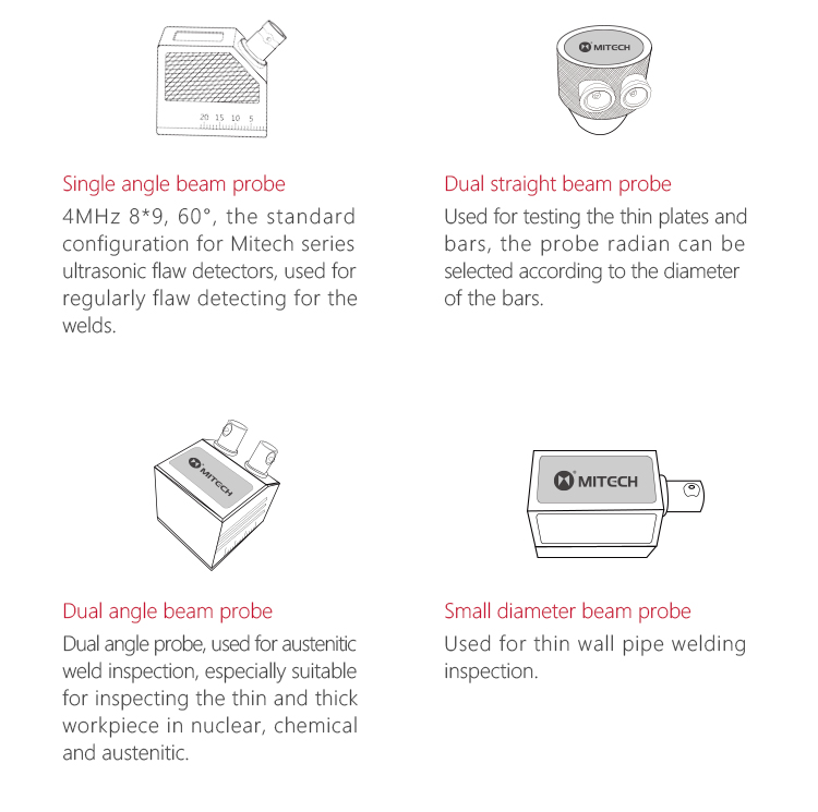 | Probe Type | straight beam probe, angle beam probe, dual element probe, through-transmit probe |
