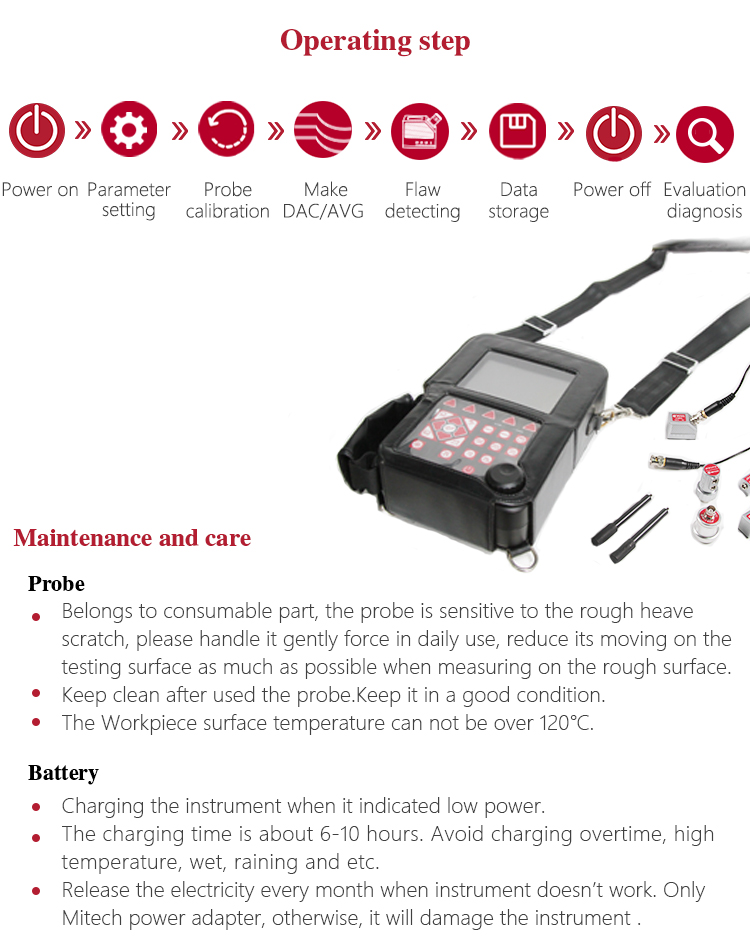 | Mitech B series products of Ultrasonic flaw detector have internal rechargeable Li-ion battery pack rated 7.2V at 8800 mAh,is the standard configuration.When using ,don't disassemble ,and only for supplied charger ,otherwise ,the battery will be damaged .If it’s not used for a long time, be sure to regularly charge and discharge(about once a month), so as to avoid failure. |