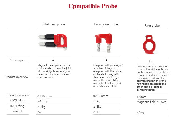 Type D probe is also called magnetic yoke probe, equips with various high magnetic turning joint, the turning joint can closely tie to the fillet weld, use magnetic suspending liquid make it magnetized, the crack in front of probe can be showed out. |