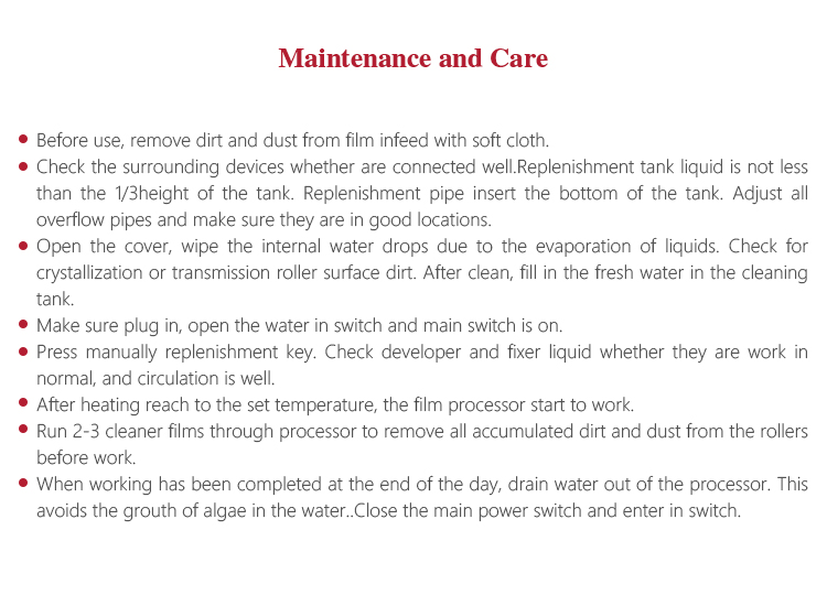 The four processes have high requirements for the temperature, time and liquid concentrations in developer and fixer. Film process has four modes, cold, preheating, wash, and self-inspection. Under cold mode, system is on electricity but not work. Under preheating mode ,working area starts to heat to certain temperature without film. When the film enters in, temperature goes up rapidly to wash film. Wash mode means film is under washing. Under self-inspection, it can check whether each component is working normally.