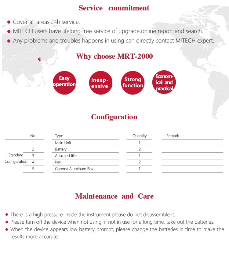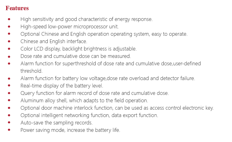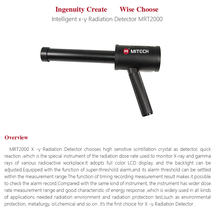 MRT2000 X -γ Radiation Detector chooses high sensitive scintillation crystal as detector, quick reaction ,which is the special instrument of the radiation dose rate used to monitor X-ray and gamma rays of various radioactive workplace.It adopts full color LCD display, and the backlight can be adjusted.Equipped with the function of super-threshold alarm,and its alarm threshold can be setted within the measurement range.The function of timing recording measurement result makes it possible to check the alarm record.Compared with the same kind of instrument, the instrument has wider dose rate measurement range and good characteristic of energy response ,which is widely used in all kinds of applications needed radiation environment and radiation protection test,such as environmental protection, metallurgy, oil,chemical and so on .It’s the first choice for X -γ Radiation Detector .